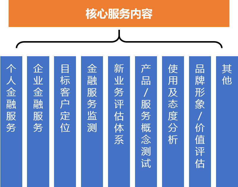 隨著外資金融機構陸續進入中國市場,中國迎來了金融業的大發展時代。金融保險行業面臨的競爭也日趨激烈,其針對消費者和公司客戶的終端調研也越來越受到關注。金融保險研究是華夏經緯的重點業務之一,公司團隊自成立以來就開始涉及金融領域的研究和營銷顧問服務,積累了豐富的經驗。華夏經緯以先進的研究理念、模型和研究團隊為支撐,能為各金融保險機構提供全方位的市場研究服務。