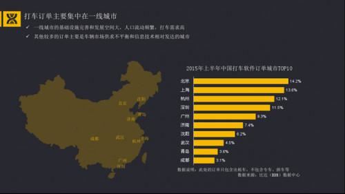 隨著移動出行市場的發展,打車軟件這個新生事物也逐漸成為人們出行選擇之一。據報告顯示,2015年審行半年中國打車軟件訂單城市TOP10分別是北京(14.2%)、上海(13.6%)、杭州(12.1%)、深圳(11.5%)、廣州(9.3%)、濟南(7.4%)、沈陽(6.2%)、武漢(4.5%)、青島(3.6%)、成都(3.1%)。
