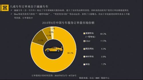 近日,中國IT研究中心(CNIT)正式發布《2015年中國移動出行應用市場研究報告》。據報告顯示,截止到2015年6月,滴滴專車(含一號專車)占據中國專車服務訂單量市場份額的80.2%。,第二名Uber的服務訂單量占市場份額的11.5%。