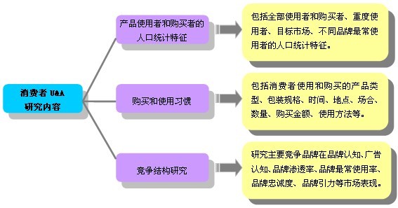 消費者U&A研究(Usage and Attitude Research)是指消費者使用習(xí)慣和態(tài)度研究,是針對某一種或某一類產(chǎn)品消費者的深入研究。通過 U&A 模型,企業(yè)可以準確的測量出被測產(chǎn)品的市場狀況、目標消費者狀況、競爭對手狀況,還可以有效的了解消費者特征和消費者行為,從而為企業(yè)下一步的市場策略或市場推廣提供指導(dǎo)性依據(jù)。